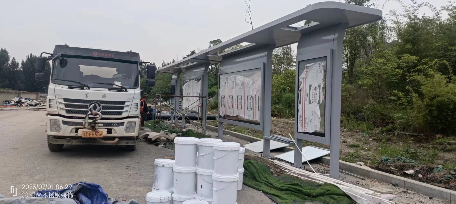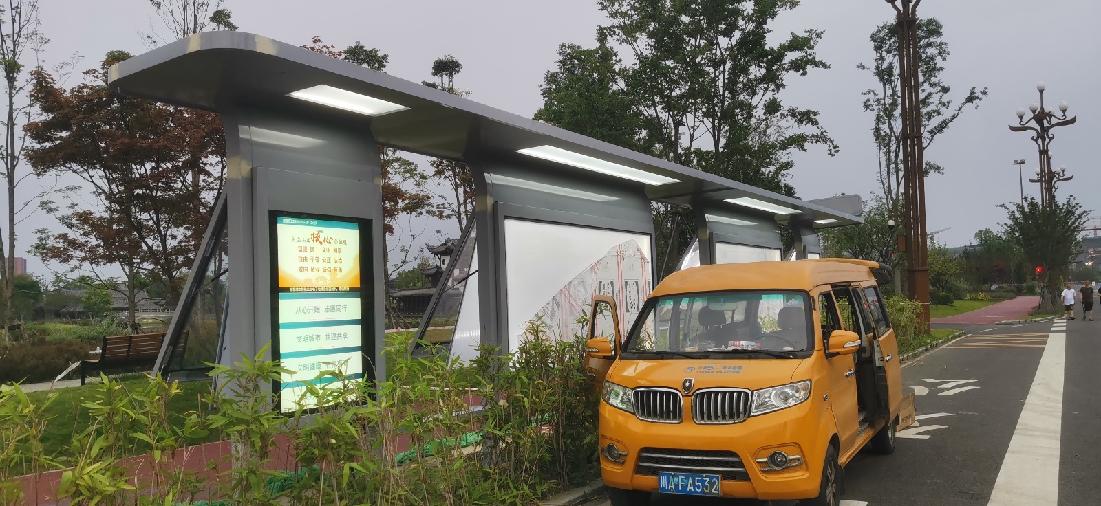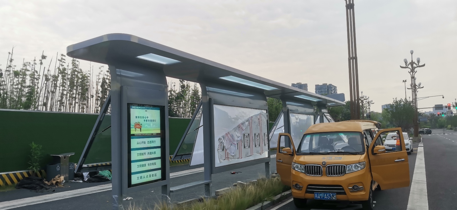 由我公司承建的該款站臺,在過去開放式一字結構的基礎上,綜合運用頂棚氛圍燈光、站名燈箱、電子報站系統(tǒng)、便民座凳等設施。簡約不簡單,即使是一座普通的鋼構站臺,也可以注入一抹亮色和溫暖。